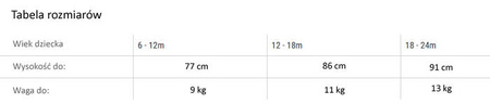 - wzrost dziecka: 91 cm, waga do 13kg;